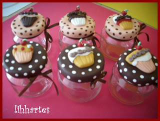 Hoje trouxe uma idéia para presentear nas festas de fim de ano, é que são tantas coisas para resolver que as vezes ficamos sem idéia do que comprar, confeccionei esses potinhos recheadinhos de gostosuras , com apliques de cupcake de biscuit, espero que gostem.